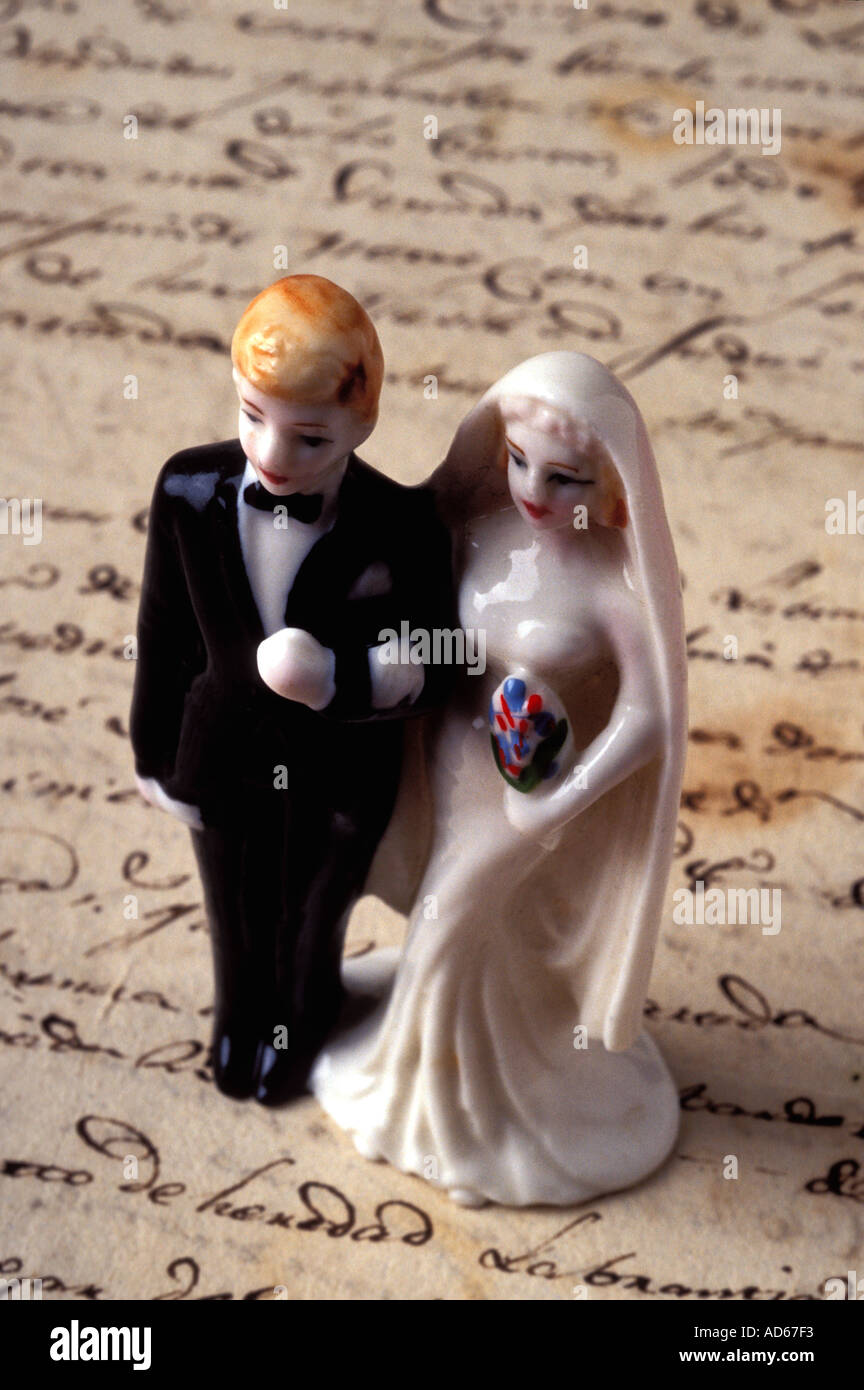 Bride And Groom Wedding Cake Topper Standing On Old Document Stock