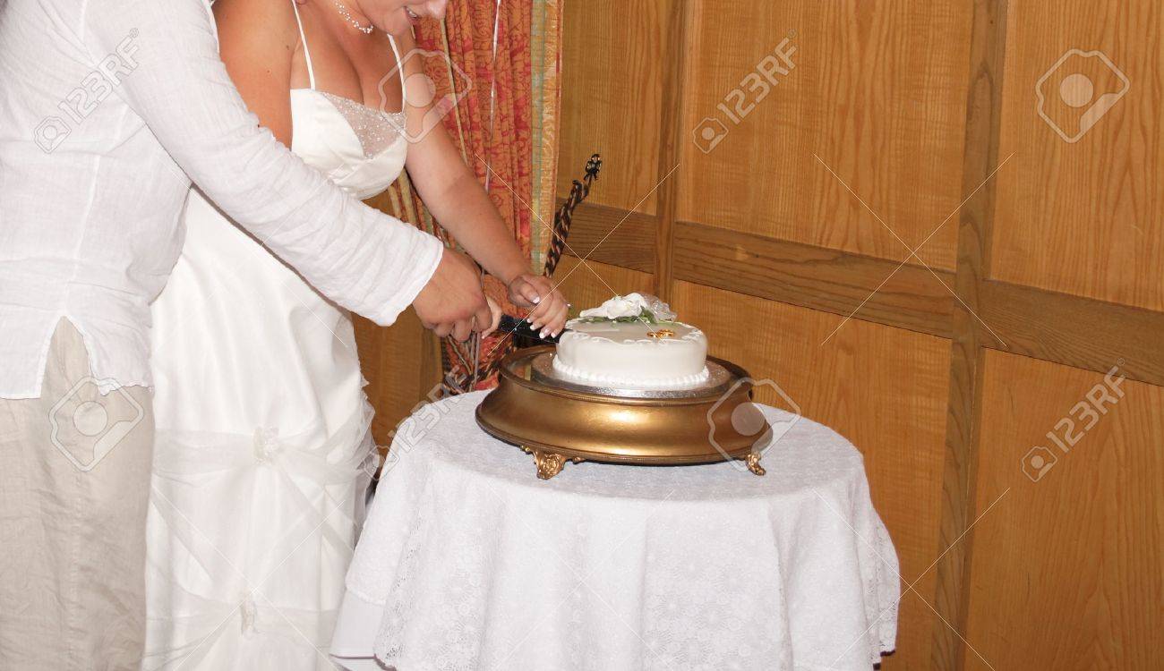 Bride And Groom Cutting A Small Wedding Cake Stock Photo Picture
