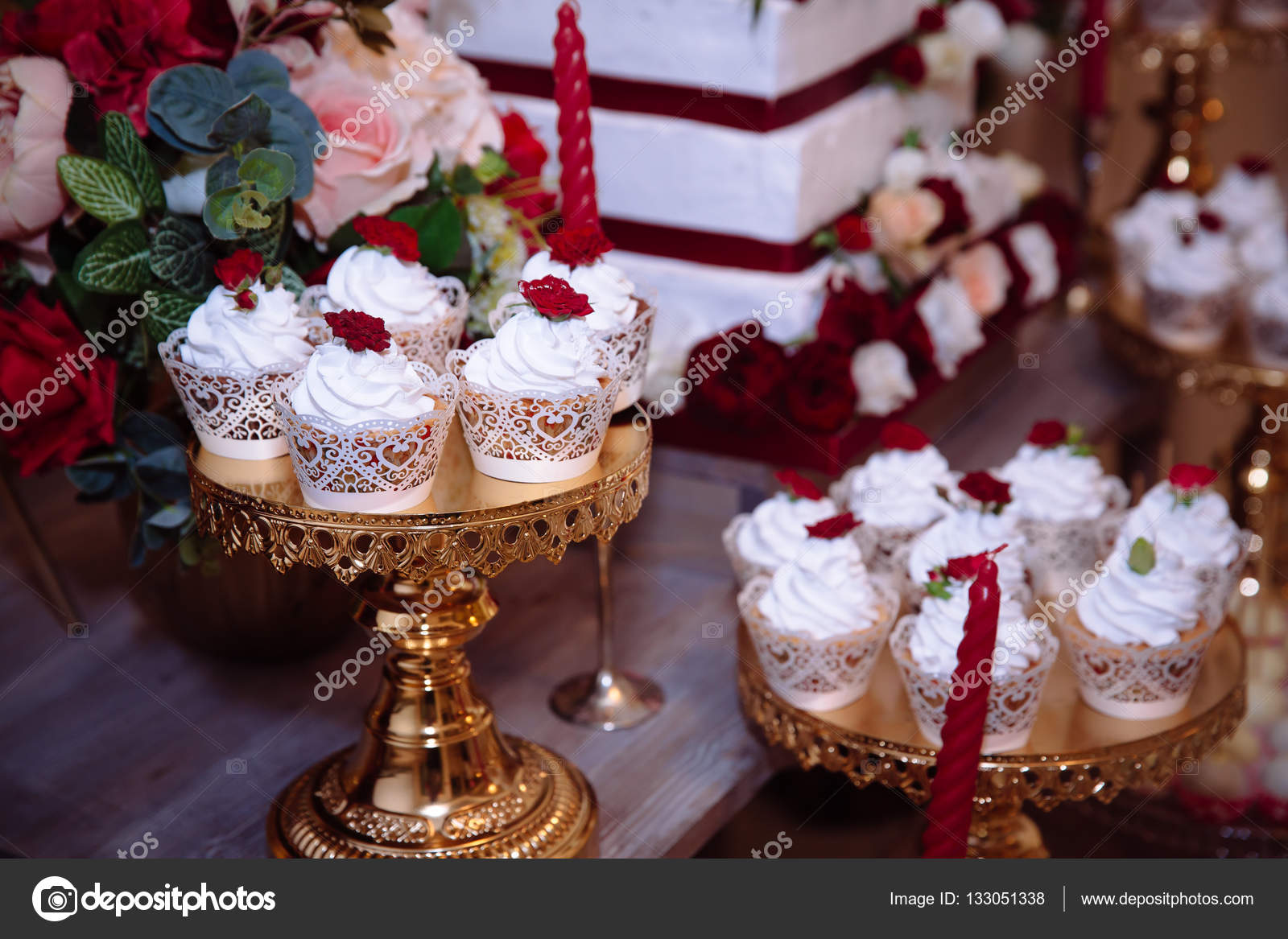 Candy Bar Red Colour Marsala Table With Wedding Cake Sweets Stock