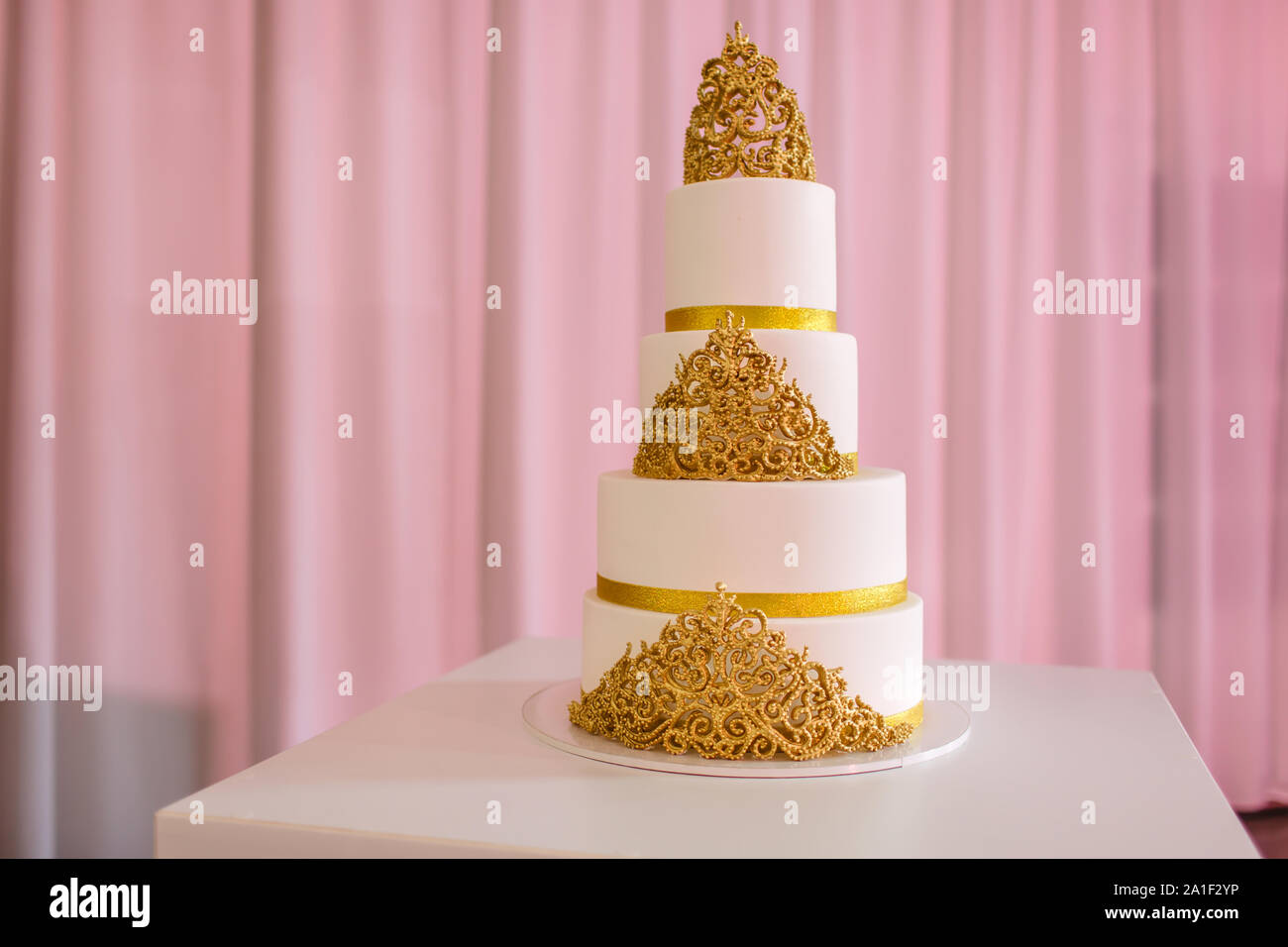 Wedding Cake With Gold Wedding Cake On White Table 3 Tiers