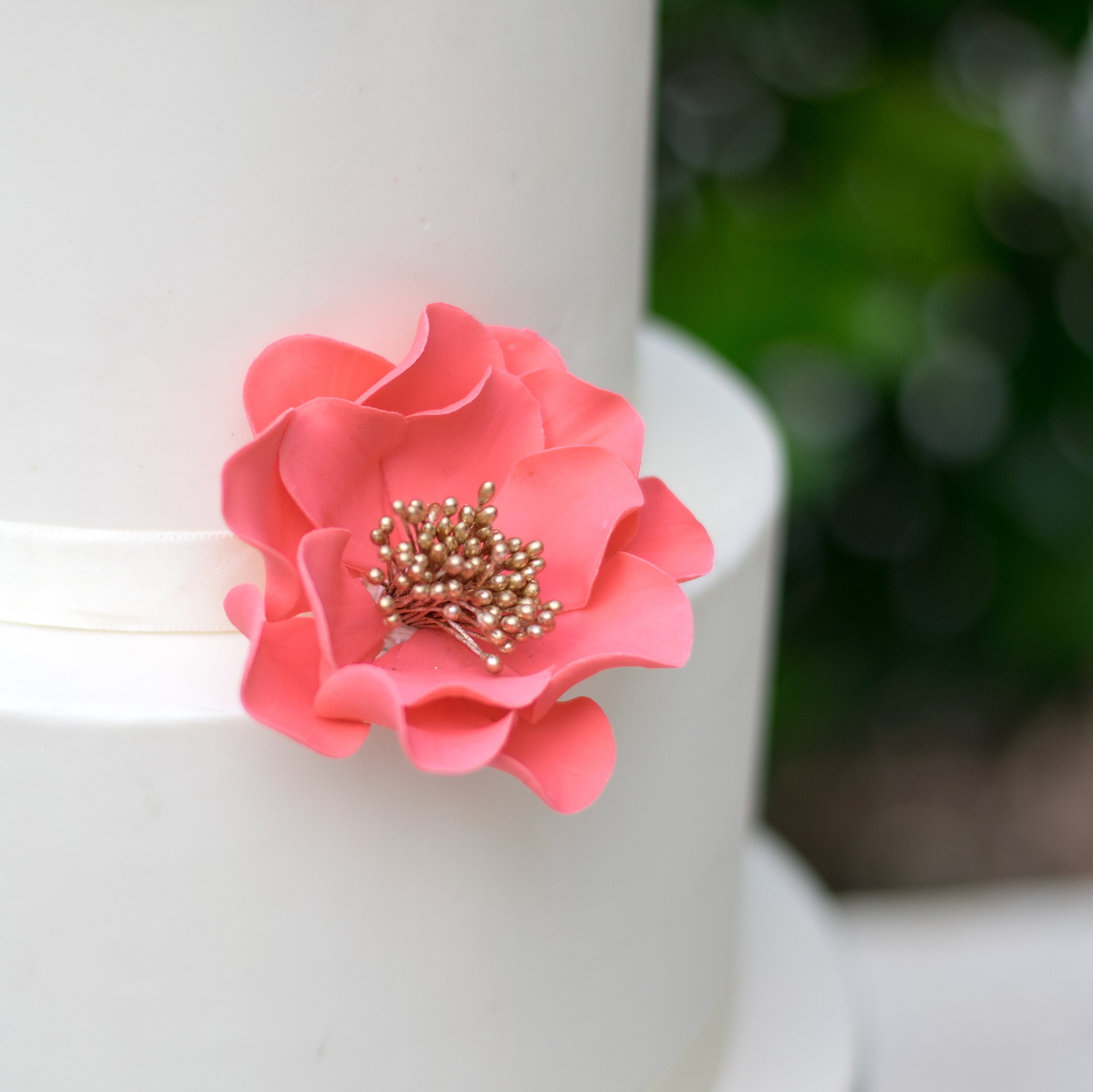 Open Rose Sugar Flower In Coral With Gold Center Wedding Cake