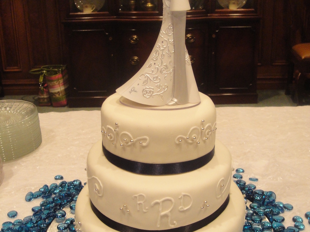 Elegant White Butter Cream Wedding Cake With Navy Blue Ribbon And