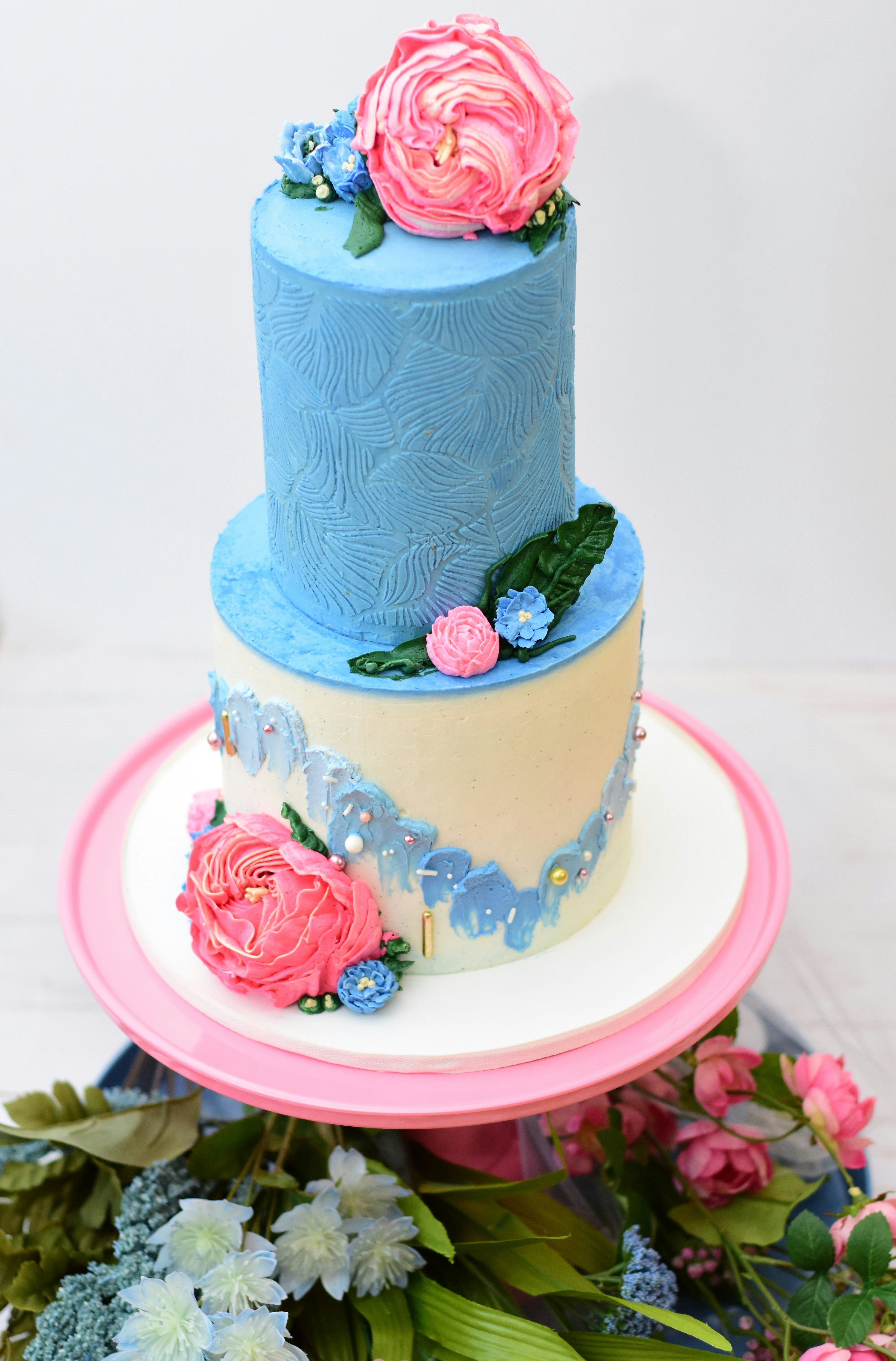 Top View Closeup Two Tiered Cake With Roses On Glass Tray Top