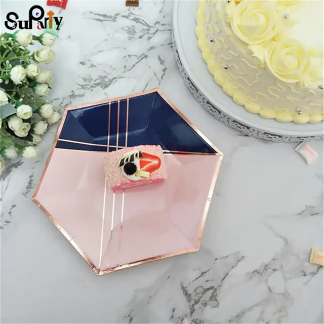 80pcs Rose Gold Paper Plate Blush Pink And Navy Blue Cake Dishes