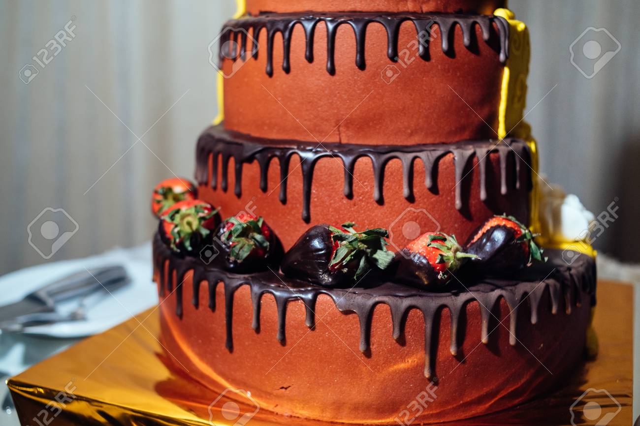 Round Multi Tiered Yellow And Brown Wedding Cake With Strawberries