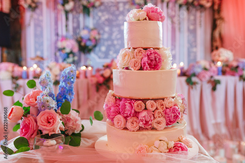 White Wedding Cake Decorated With Peony Roses On Pink Restaurant