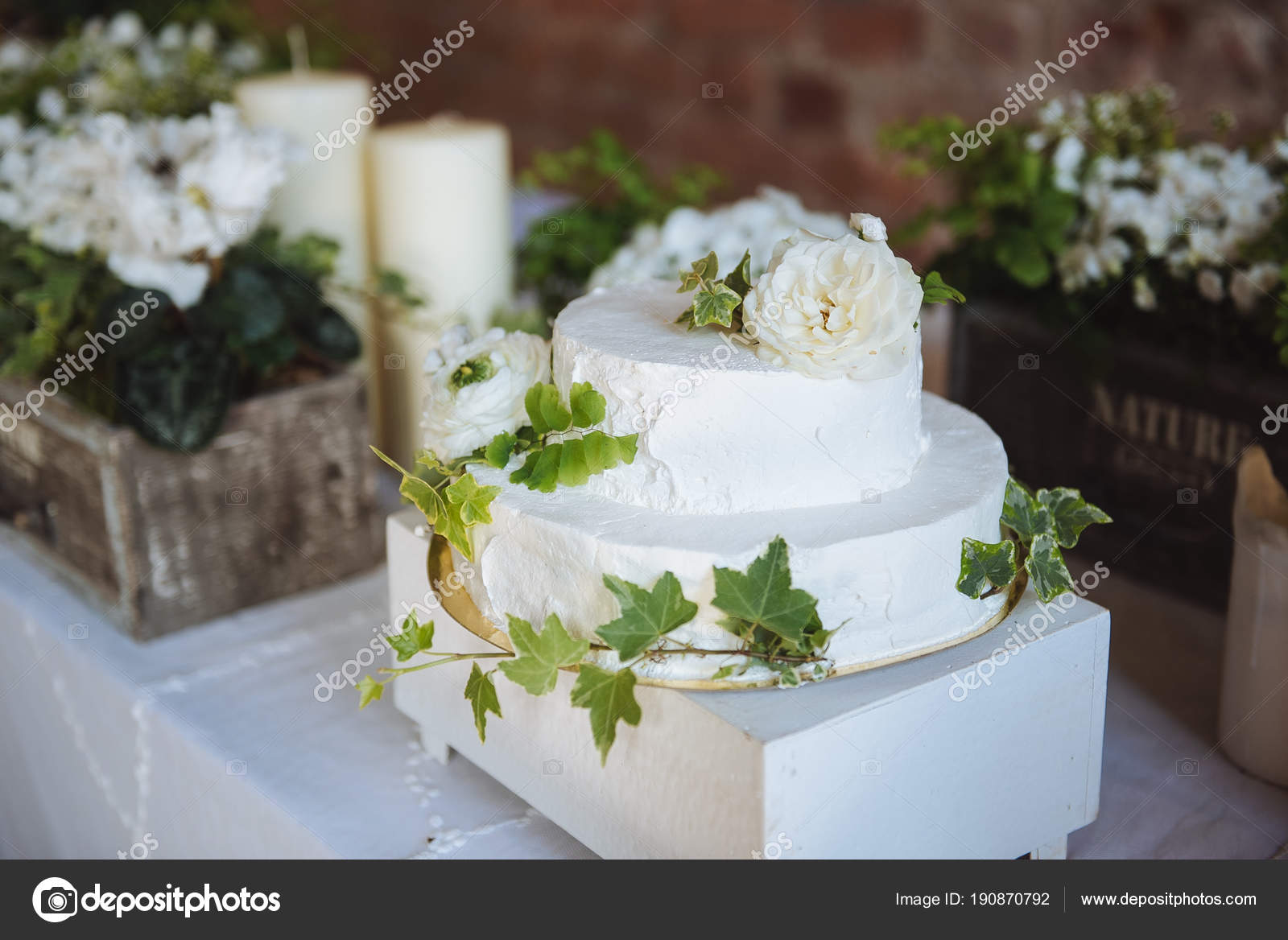 Wedding Cake White Small Flowers Green Leaves Table Candlesflowers