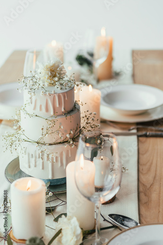 Close Up View Of Stylish Table Setting With Candles And Wedding