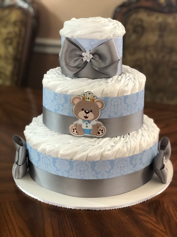 3 Tier Diaper Cake Grey And Blue Diaper Cake Royal Teddy Etsy