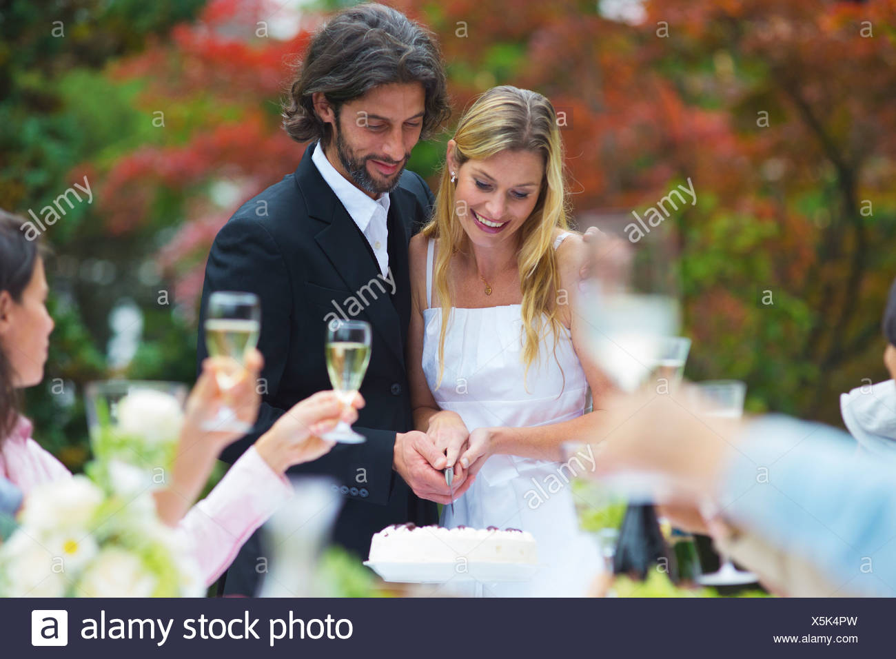 Bride And Groom Cutting Wedding Cake On A Garden Party Stock Photo