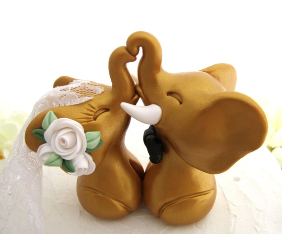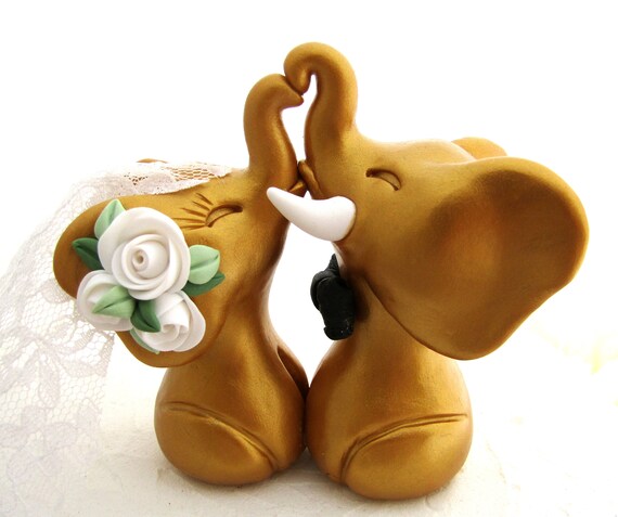 Gold Elephant Wedding Cake Topper White Roses And Lace Veil Etsy