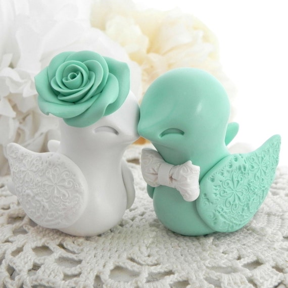 Wedding Cake Topper Love Birds Mint Green And White Bride Etsy