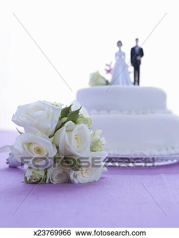 Wedding Cake With Bride And Groom On Top Bouquet In Foreground