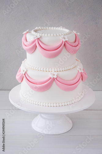 White Wedding Cake With Pink Elements Made From Pastry Mastic On A