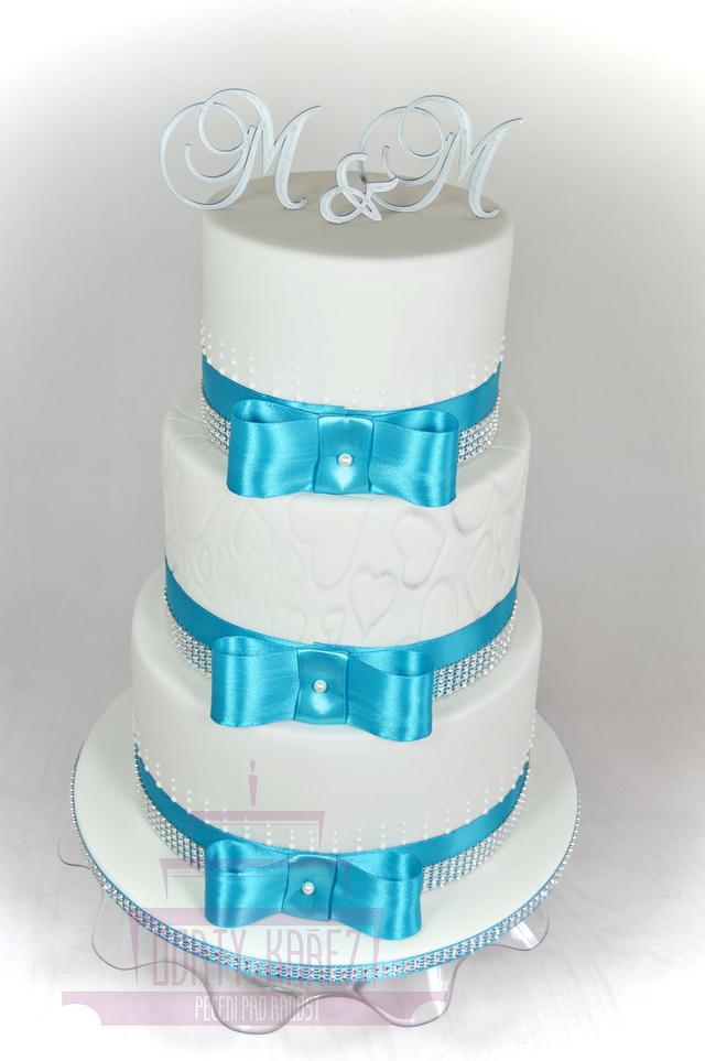 Wedding Cake With Turquoise Mastic And White Lace Icing Decorated