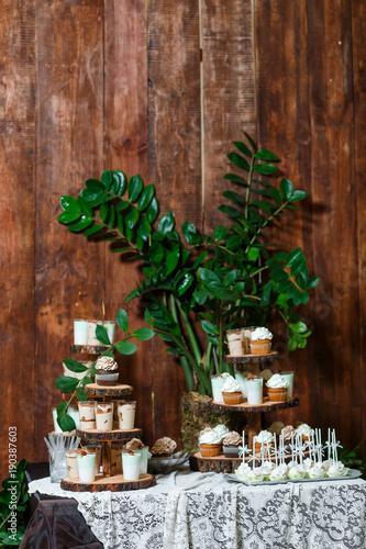 Candy Bar On Wooden Wedding Party With A Lot Of Different Candies