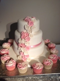 Three Tier Classic Pink And Ivory Wedding Cake With Cupcakes