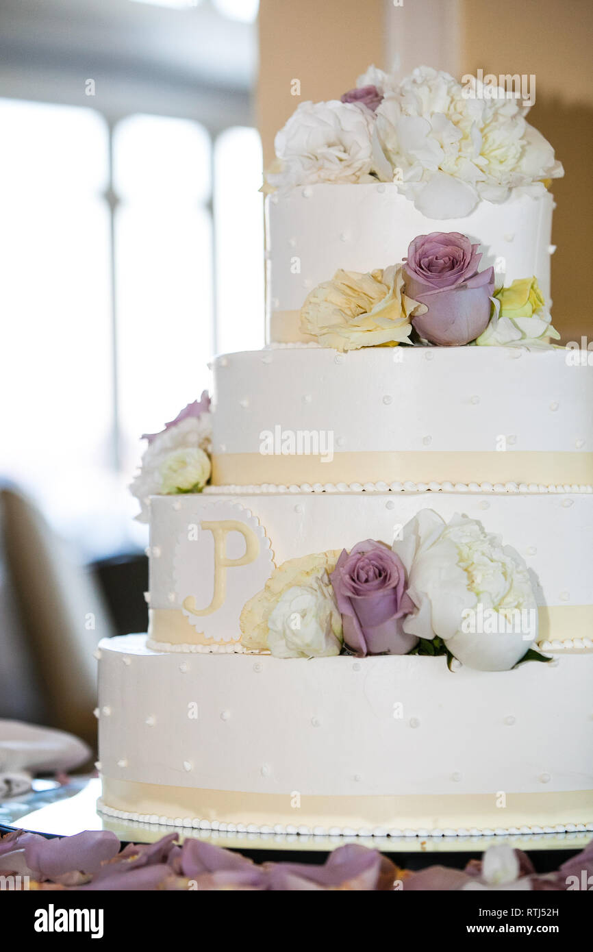 White Wedding Cake With Yellow White And Purple Flowers 4 Tiers