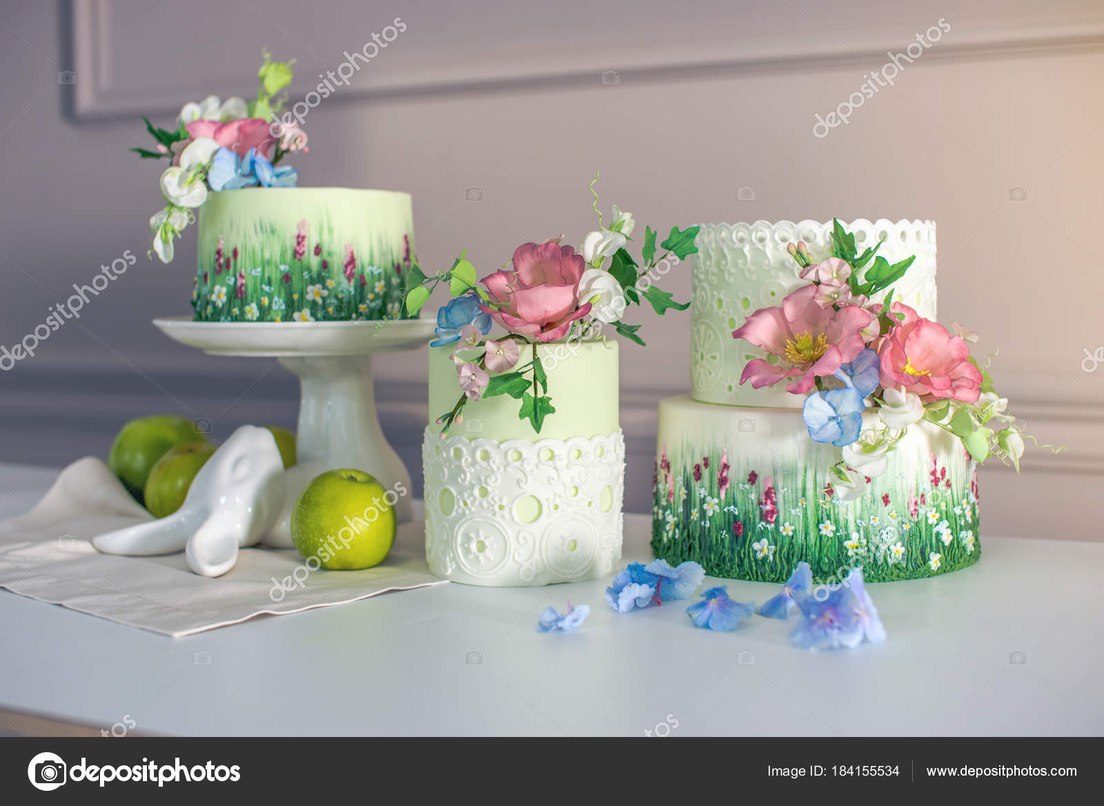 Wedding Spring Cake Decorated With Colorful Flowers And Hydrangeas