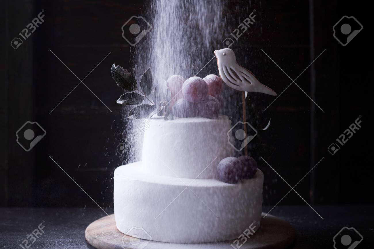 White Two Tiered Cake Decorated With A Bird Grapes And Leaves