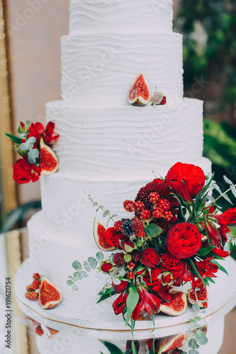 Wedding Cake With Red Fresh Flowers And Fresh Fruits Buy This