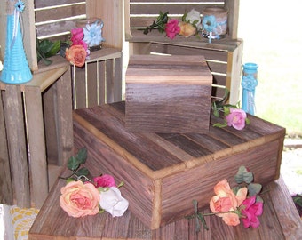 An oldcrate simply reused as a cake cupcake display piece adding height charm to a rustic country outdoor wedding love the crate for the cake stand very clever.