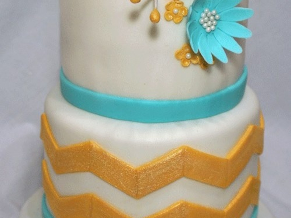 Gold textured wedding cake. Yellow ombre wedding cake. Blue ombre bands wedding cake.