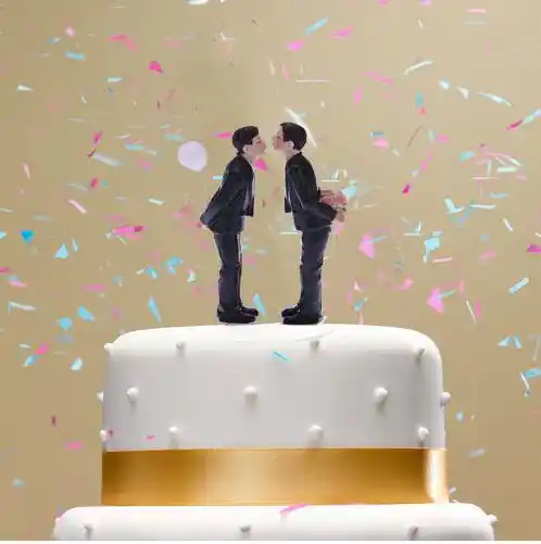 A Wedding Cake Featuring Two Brides And Two Grooms Is On Display