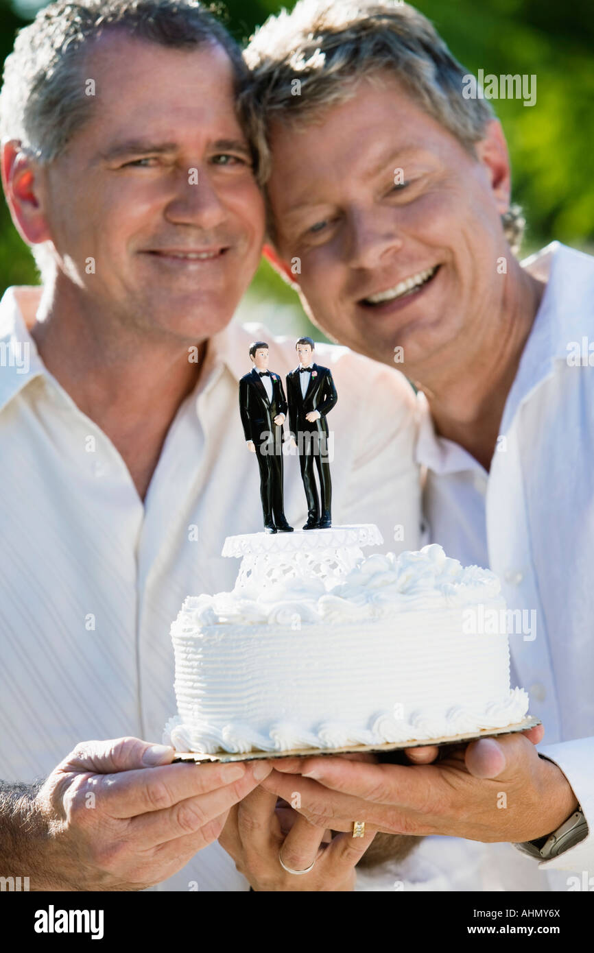 Gay Couple Displaying Wedding Cake With Two Grooms Stock Photo